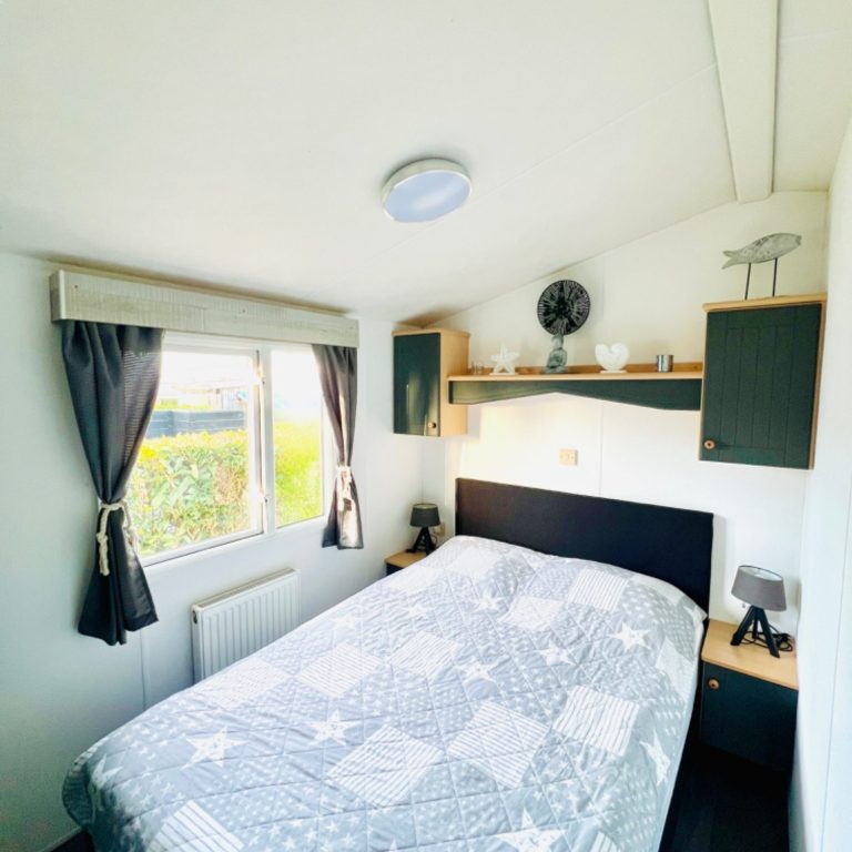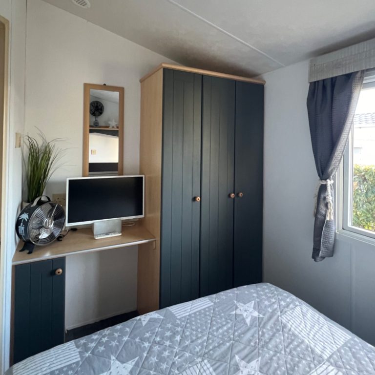 Hier finden Sie auch einen praktischen Kleiderschrank, zwei Hängeschränke über dem Bett und zwei gemütliche Nachttische.