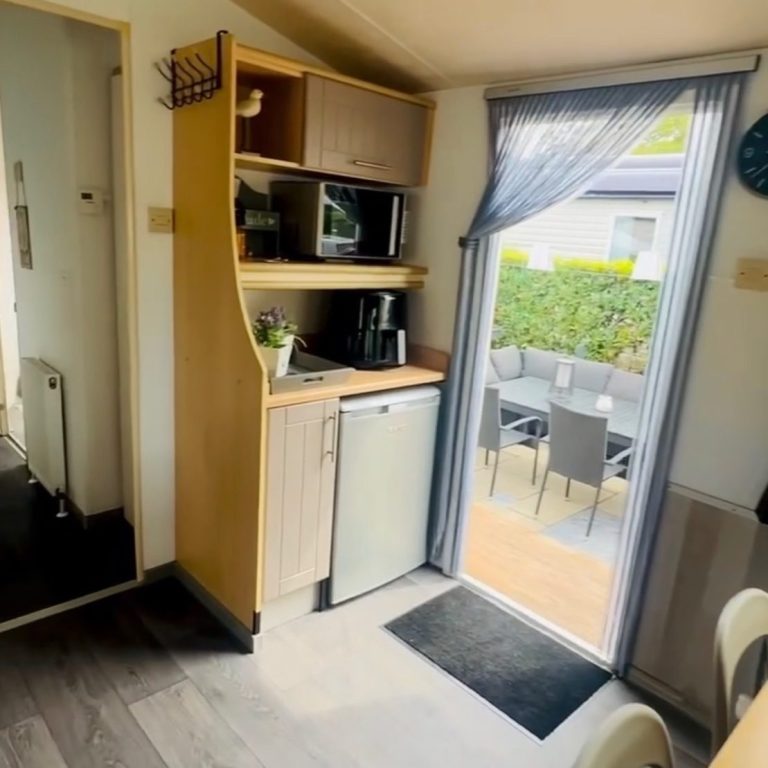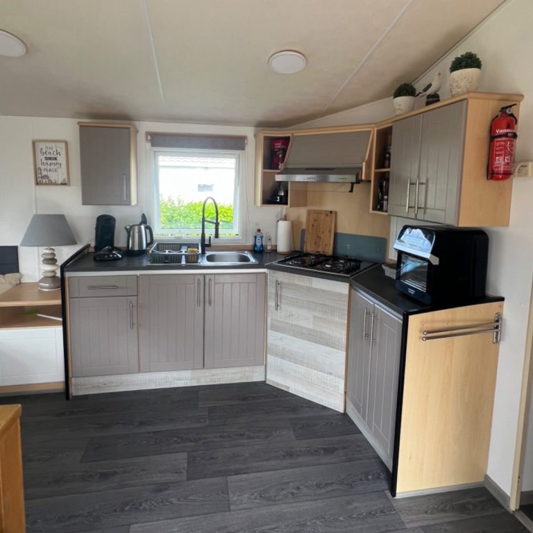 Die Küche bietet alles, was du zum Kochen brauchst! Hier findest du einen Gasherd, einen Airfryer, eine Mikrowelle und einen praktischen Minibackofen. Du hast sogar die Wahl zwischen zwei Kühlschränken – einer davon hat ein kleines Gefrierfach für deine Leckereien!