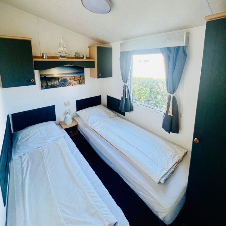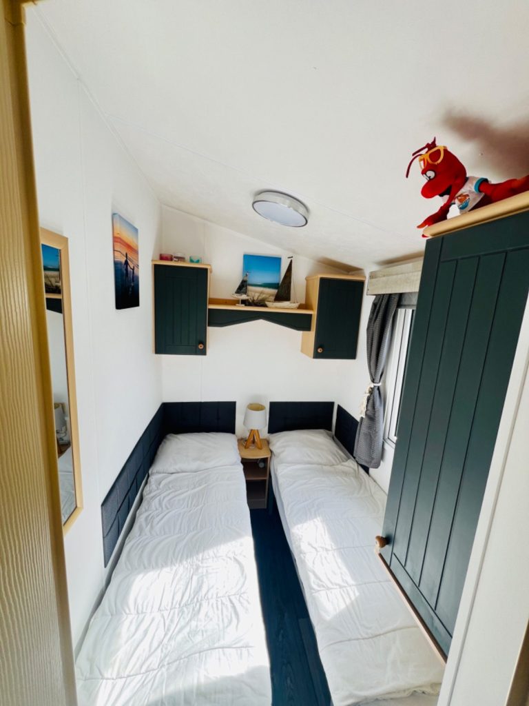 Im 2. Schlafzimmer erwarten Sie zwei Einzelbetten (80 x 1,90 und 70 x 2,00) und ein schmaler, hoher Kleiderschrank, in dem Sie Ihre Sachen ordentlich verstauen können. Auch hier gibt es zwei Hängeschränke über den Betten.