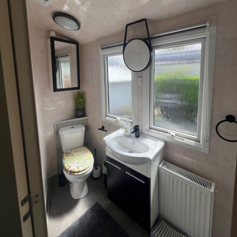 Hier findest du eine Toilette und einen Waschtisch, zusätzlich dazu gibt es einen praktischen Hängeschrank, um deine Dinge zu verstauen.